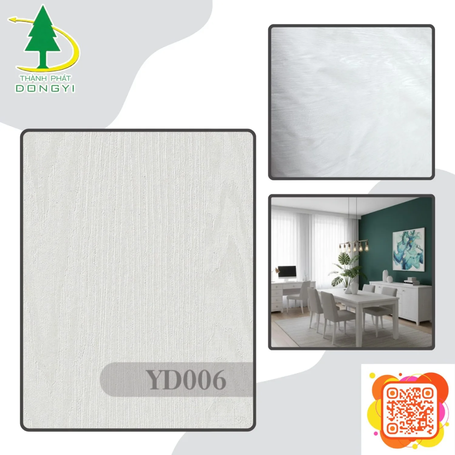 Màng PVC YD006 mang đến một định nghĩa mới về vật liệu nội thất. Sở hữu tông màu Trắng Sồi (Soft White Oak) thanh lịch, điểm đặc biệt nhất của mã màu này chính là bề mặt được xử lý công nghệ cao, tạo cảm giác êm ái, mềm mịn như chạm vào vải (Fabric feel), rũ bỏ sự lạnh lẽo, cứng nhắc thường thấy của vật liệu công nghiệp.